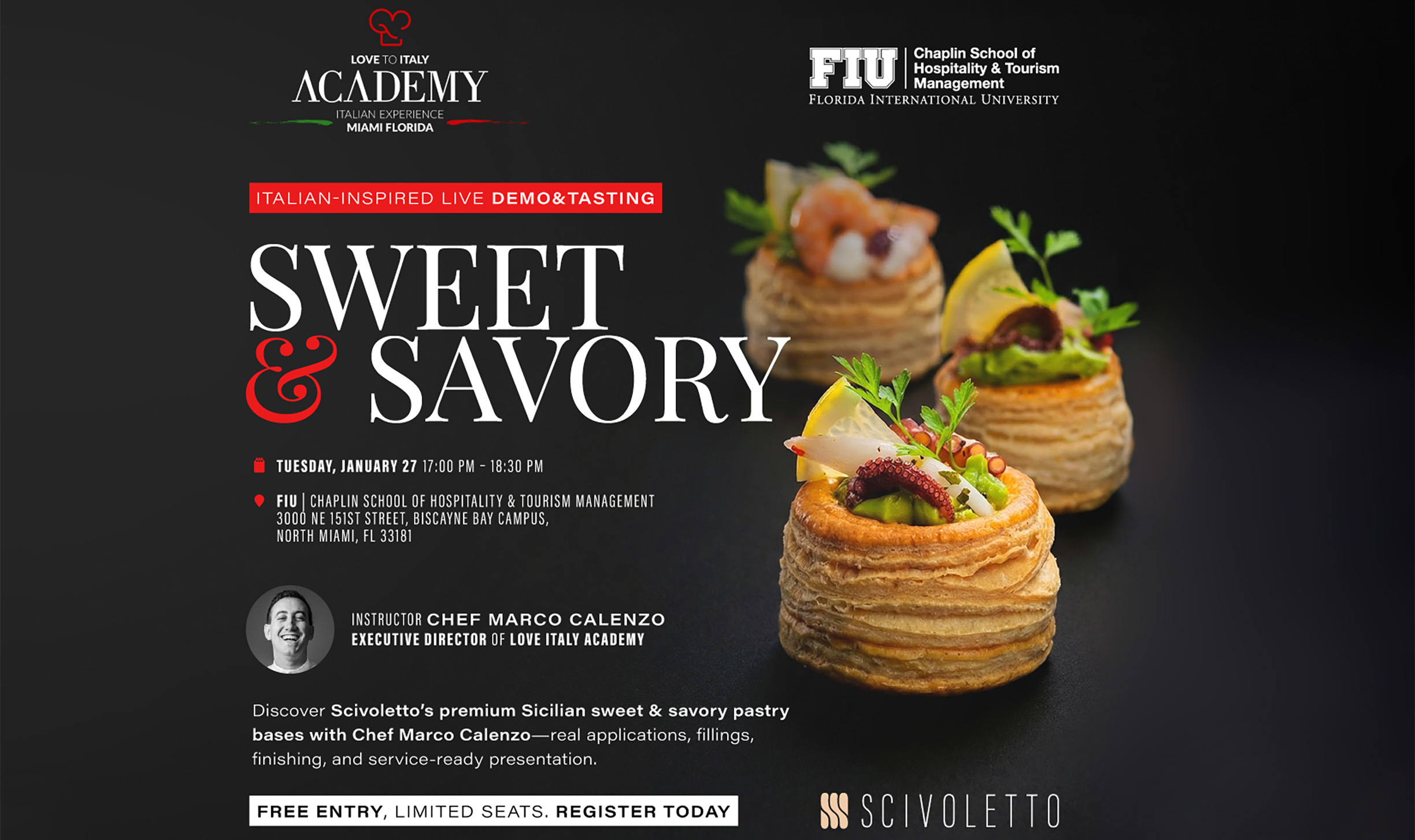 El evento se celebrará el martes 27 de enero, a las 5 de la tarde, en la Escuela Chaplin de Hotelería y Gestión del Turismo de Florida International University, ubicada en North Miami (Biscayne Bay Campus), y propone un enfoque práctico que se centrará en el uso de las bases y productos Scivoletto, los cuales se pueden usar tanto en preparaciones dulces como saladas.