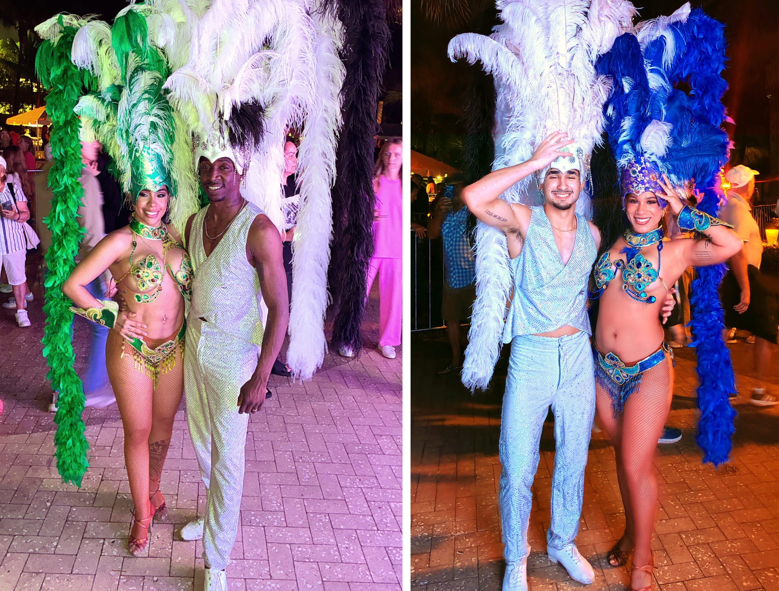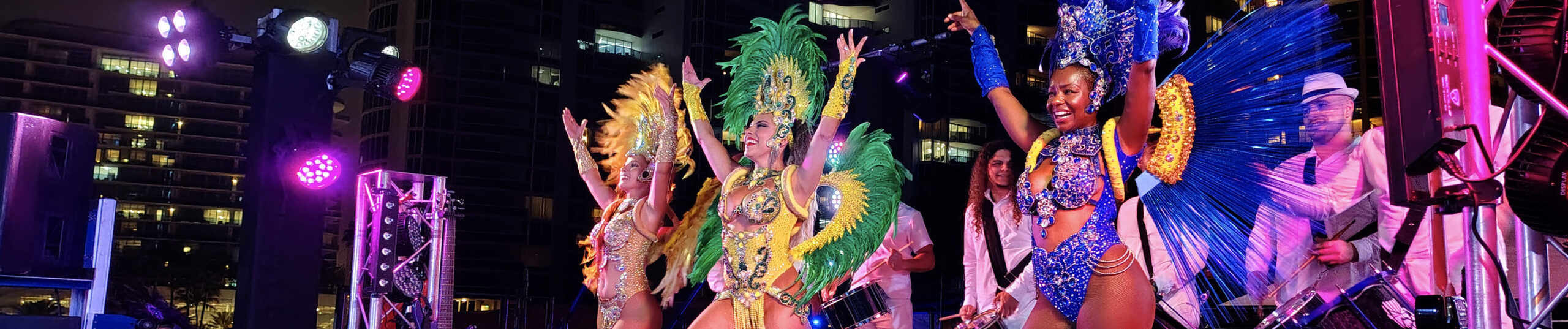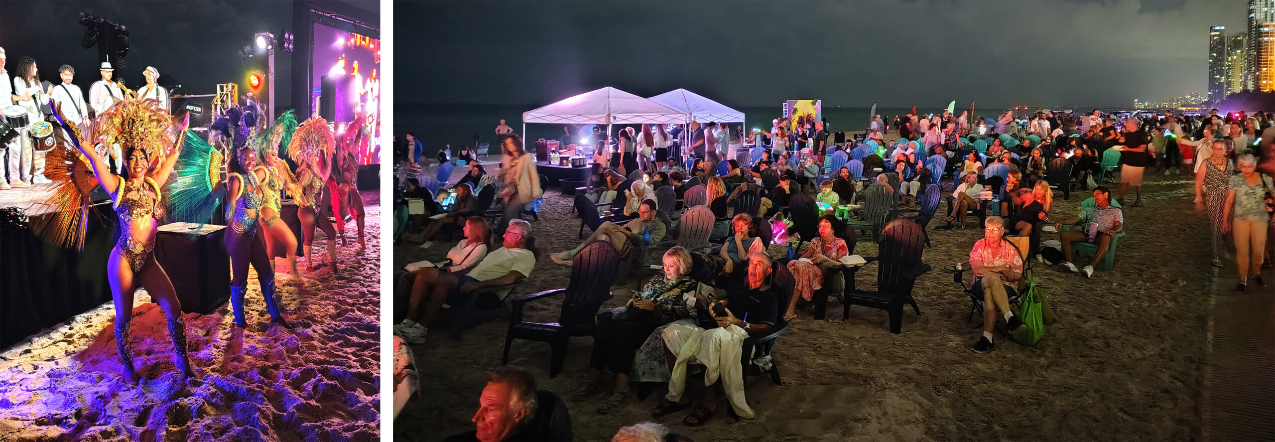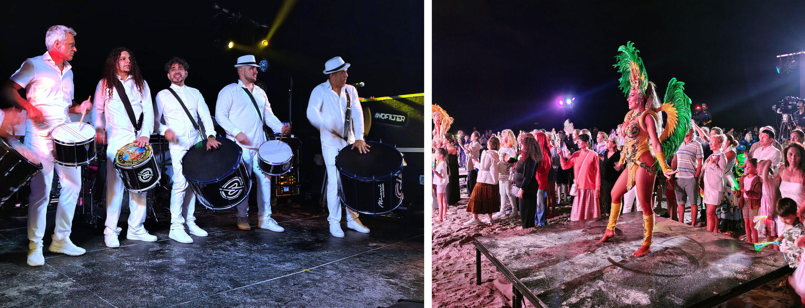 En la playa, un gran escenario se convirtió en el epicentro del espectáculo, donde bailarinas de samba brasileña ofrecieron una presentación llena de brillo y dinamismo. Al compás de los tambores y la percusión típica del carnaval, siete bailarinas cautivaron al público, que rápidamente se dejó llevar por la música y el baile, contagiándose de su entusiasmo.